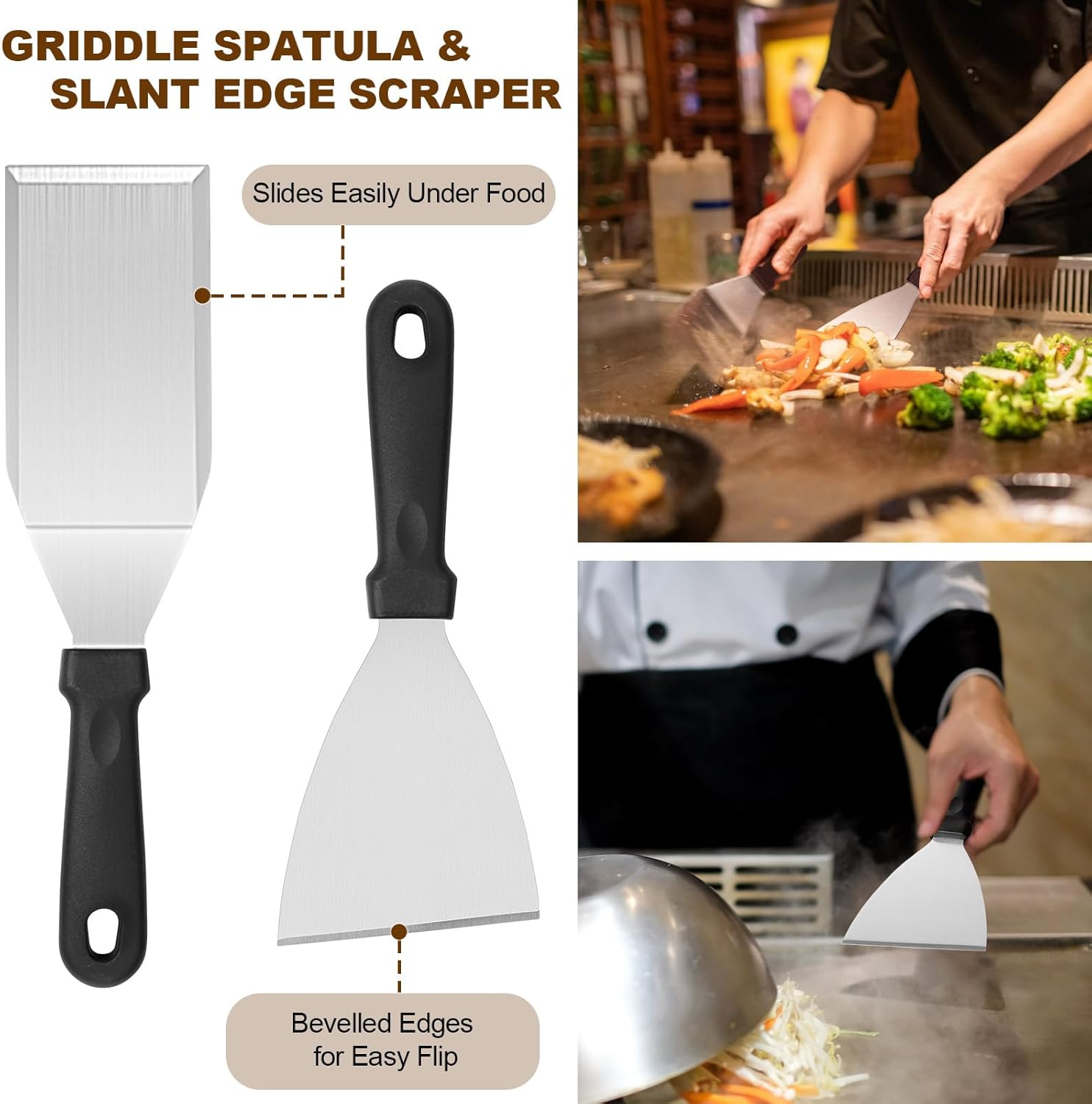 【Chef’s Choice griddle accessories kit】This grill tools set with griddle scraper, spatulas and oil bottles helps you to grill as easily as a restaurant chef. Great for flipping burgers, pancakes, veggies, cutting bread,meat and sausage, scraper & chopper to dice food and scrape griddles clean. The Long Griddle Spatula can move large amounts of food quickly and accurately. Egg rings and pepper shakers to enhance your griddle cooking experience.
