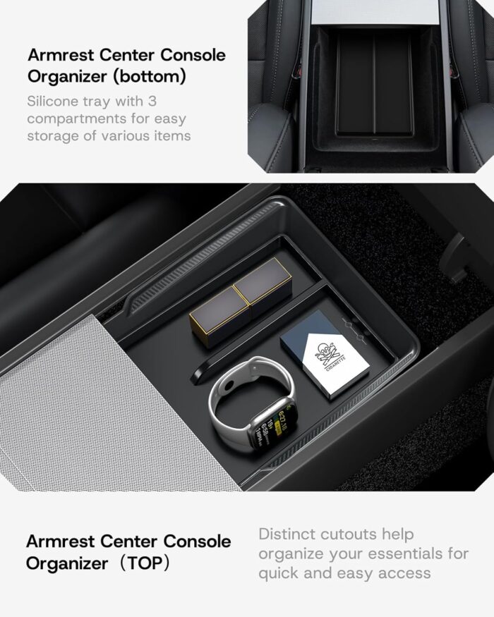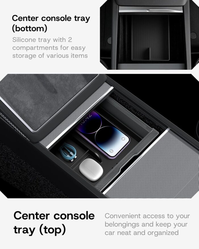 GREAT HELPER for VEHICLE ORGANIZER: The new model y center console organizer bin keeps things more tidy and well-organized. Smartphones, keys, beverages, adapter, tissues, cards, make-ups, chewing gum, etc., all of these things can be placed more organized than before