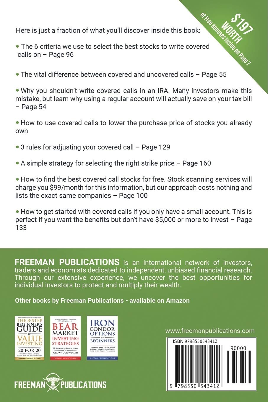 The 6 criteria we use to select the best stocks to write covered calls on – Page 96The vital difference between covered and uncovered calls – Page 55Why you shouldn’t write covered calls in an IRA. Many investors make this mistake, but learn why using a regular account will actually save on your tax bill – Page 54How to use covered calls to lower the purchase price of stocks you already own3 rules for adjusting your covered call – Page 129A simple strategy for selecting the right strike price – Page 160How to find the best covered call stocks for free. Stock scanning services will charge you $99/month for this information, but our approach costs nothing and lists the exact same companies – Page 100How to get started with covered calls if you only have a small account. This is perfect if you want the benefits but don’t have $5,000 or more to invest – Page 133