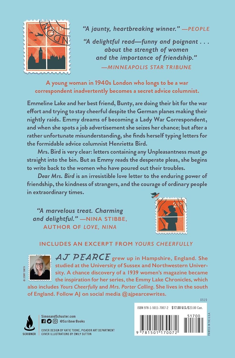 “Fans of Jojo Moyes will enjoy AJ Pearce’s debut, with its plucky female characters and fresh portrait of women’s lives in wartime Britain” (Library Journal)—a love letter to the enduring power of friendship, the kindness of strangers, and the courage of ordinary people in extraordinary times. “Headlined by its winning lead character, who always keeps carrying on, Pearce’s novel is a delight” (Publishers Weekly). Irrepressibly funny and enormously moving, Dear Mrs. Bird is “funny and poignant…about the strength of women and the importance of friendship” (Star Tribune, Minneapolis).