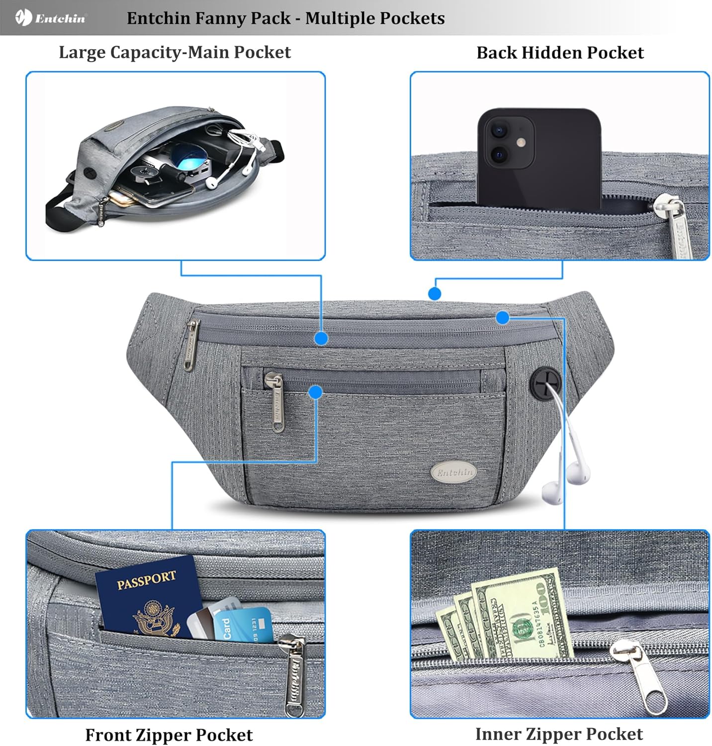 【Large Capacity & Many Pockets】 Our waist bag is well constructed with four zipper pockets, allowing you to keep your belongings separated and well-organized. Storage for any cell phone( iPhone 15 Pro, Samsung Note), passport, power bank, water bottle, keys, and other essentials.