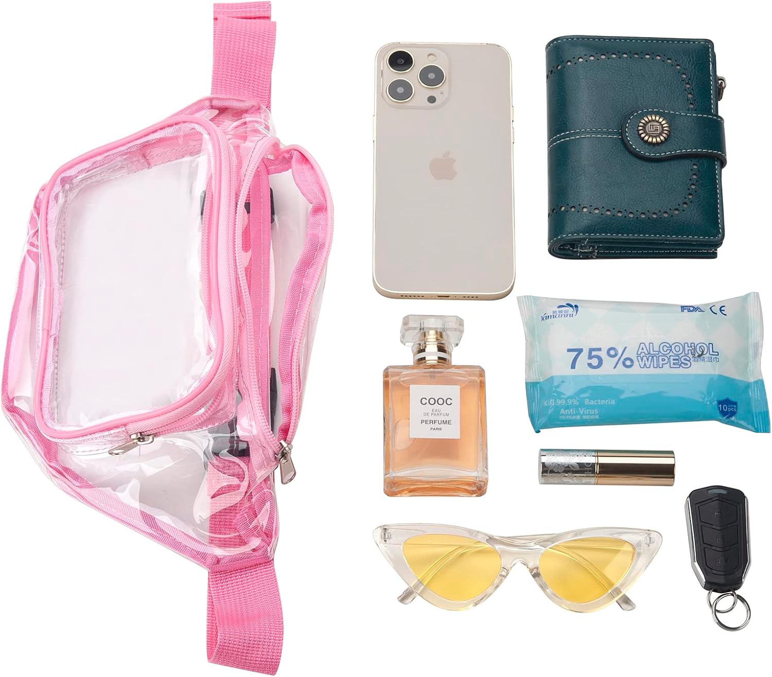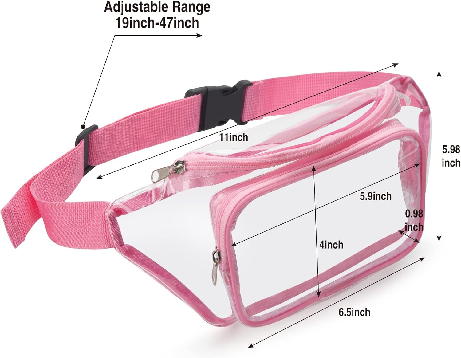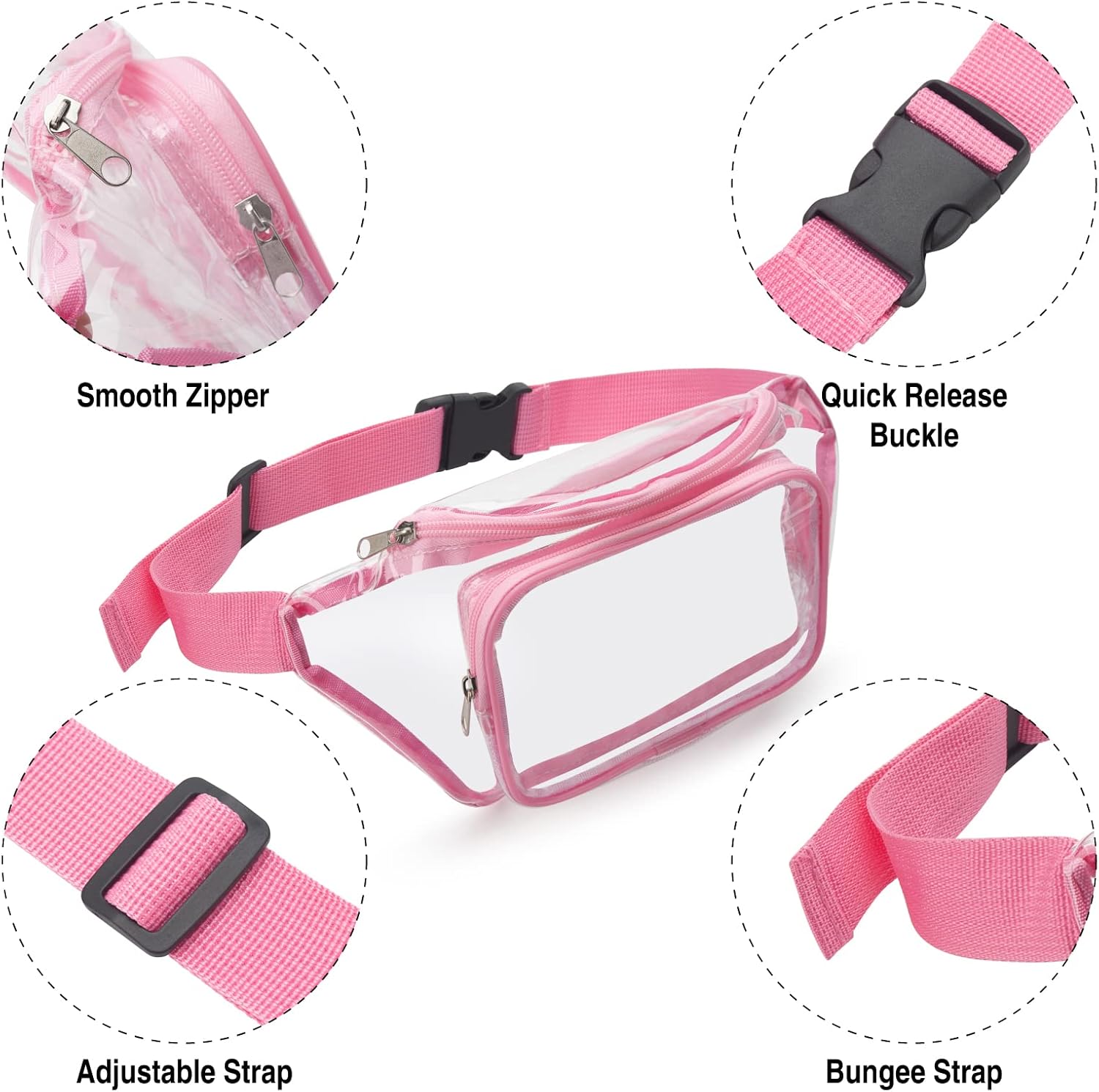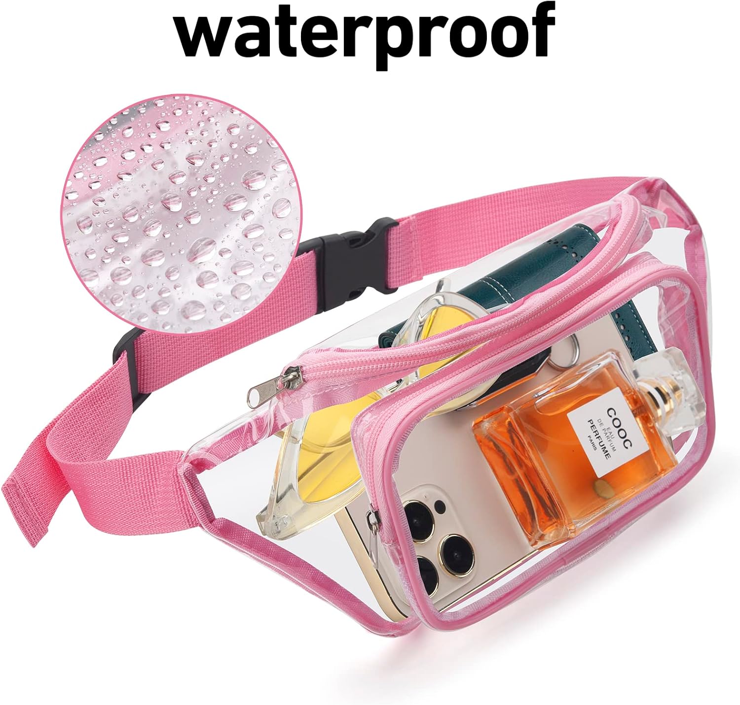Great Fabric for Comfortable and Long-Lasting Usage — This clear fanny packs is made of 0.6mm thick waterproof pvc, keeping all your stuff dry all the time. But do not be submerged in water or in heavy rain in case the water will get in through the zippers.