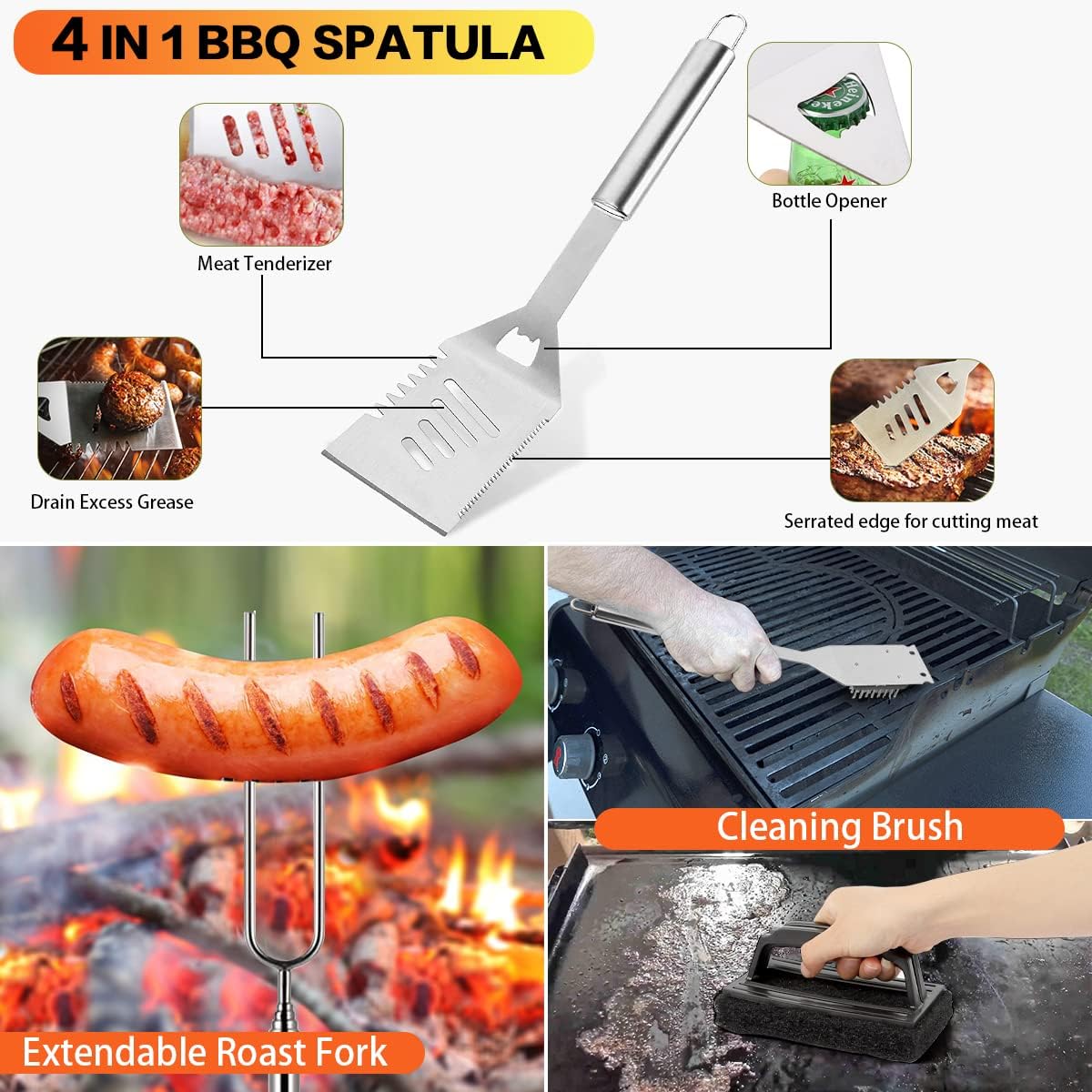 〔Most Complete Set〕: Our 144pcs BBQ set is the most complete grill accessories set on the market. It includes 4-in-1 BBQ spatula, extendable roast fork, normal spatula, slotted spatula, 2 basting cover, grill tongs, grill fork, meat knife, basting brush, fish turner, chopper, scraper, meat injector, plastic burger press, 100 bamboo skewers, 4 BBQ skewers, 2 silicone glove, 4 corn holders, 2 sauce dispenser(16oz), 2 egg rings, 2 spice shaker, cleaning brush,10 hooks.