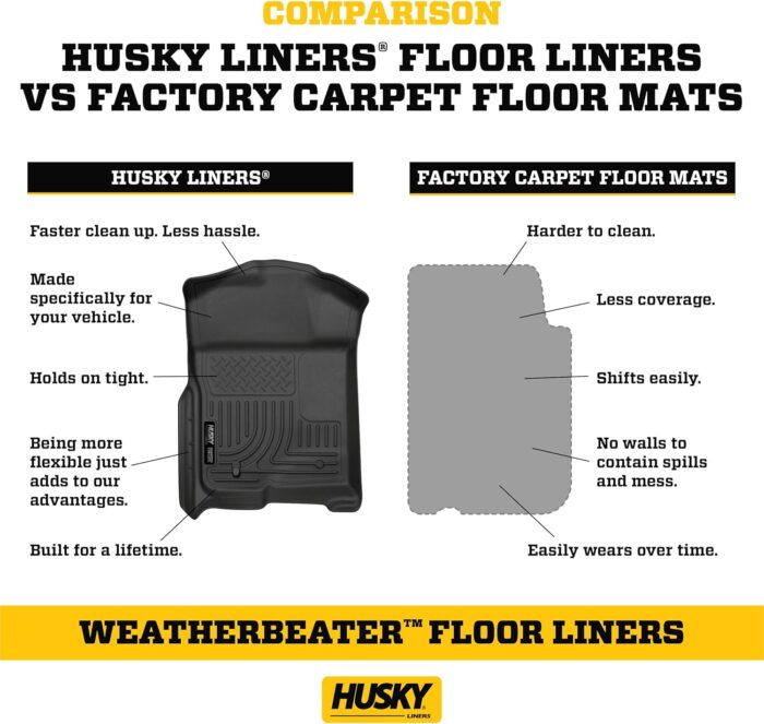 LASER-TIGHT FIT MEETS DURABILITY | The Weatherbeater combines a laser-tight fit with the high durability that built the Husky reputation. The original all-weather liner is ready, come rain, snow or dropped coffee. The Weatherbeater’s construction is a no-slip zone with no edge curl, and its StayPut Nibs keep it firmly anchored underfoot. It stands up to the adventures of everyday life while staying tough and flexible, even under extreme temperatures. Its laser-scanned, FormFit Design gives your truck, van, or SUV an ultra-clean look with easy cleanup to match, while its FormFit Edge keeps spills contained and carpets unstained. It’s unbeatable Husky protection guaranteed for life. Proudly made in the USA.
