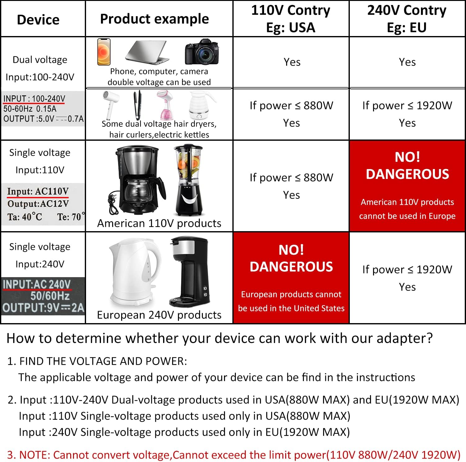 【Upgrade Worldwide Adapter】:100% Suit for all usb devices likes Phones, Cameras and Laptops, tablets and other small power dual voltage appliances used all over the world. And Suit for selective Dual Voltage Hair Dryer, Dual Voltage Straightener, and Dual Voltage Curling Iron etc. Please check with the pic and video, or contact us WHEN USING HIGH POWE DIVICE TRAVEL PLEASE MAKE SURE YOUR DEVICE SUPPORTS DUAL VOLTAGE (110V Max 880W,Like USA;250V Max 2000W,Like EU )