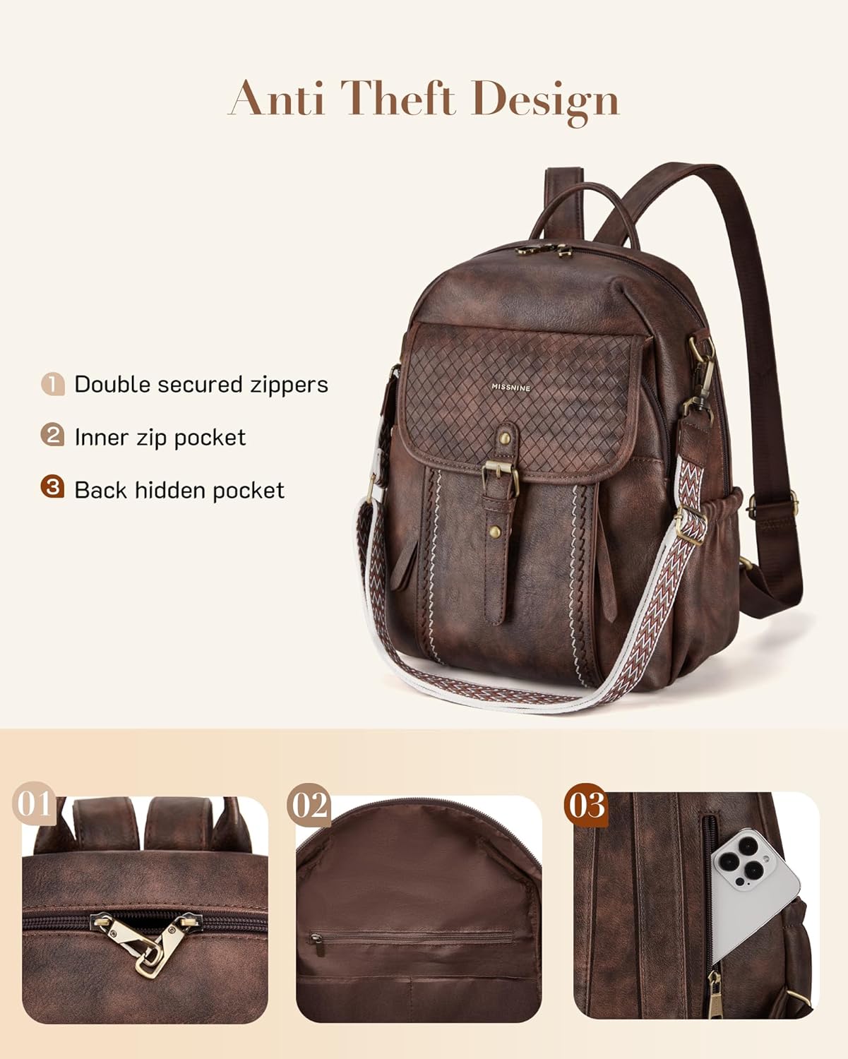 Anti-theft Lock Zippers: Enjoy an extra layer of security courtesy of eye-catching locking zippers equal parts fashionable and functional. The zippers of PU leather backpack adopt durable SBS material which runs smoothly and evenly